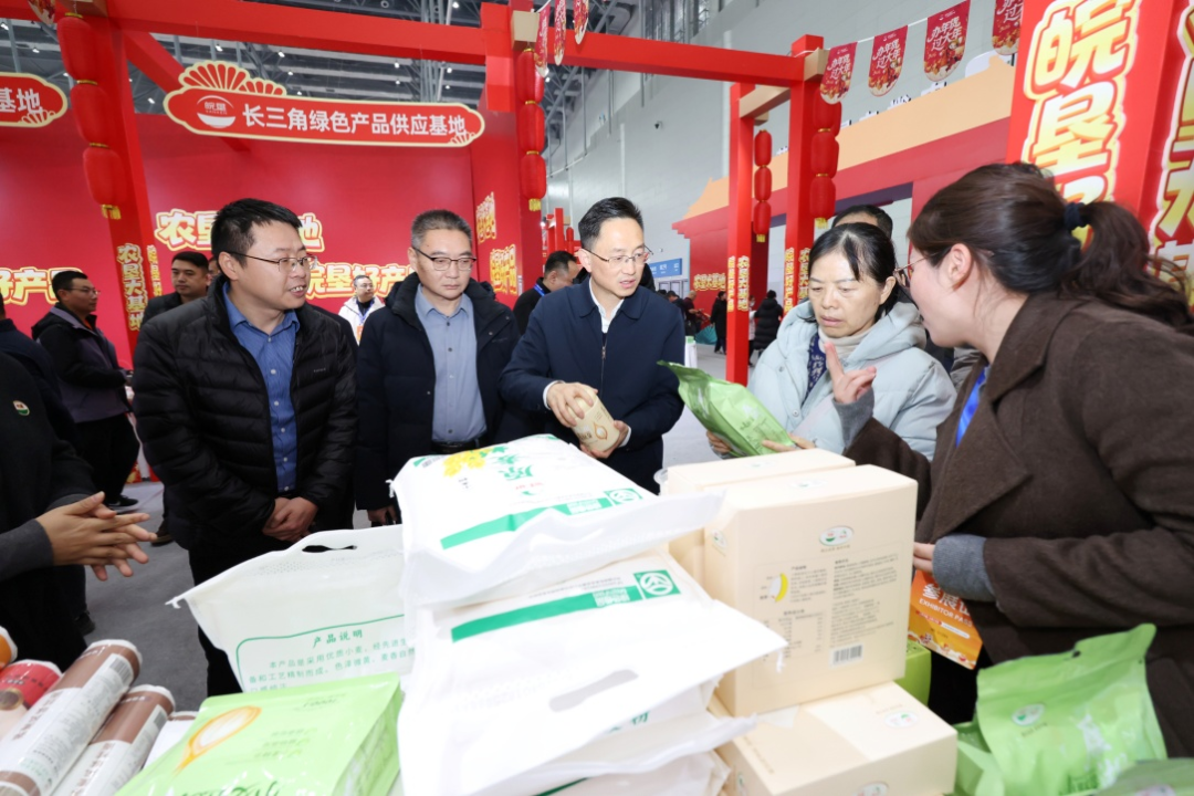 郭家满到农垦产品展台巡查,对农产品公司推出的多款春节礼包产品给予肯定,详细了解今年华阳河稻虾米的品种更新、雁湖小麦胚芽新包装等情况,品尝敬亭绿雪红茶新款产品……