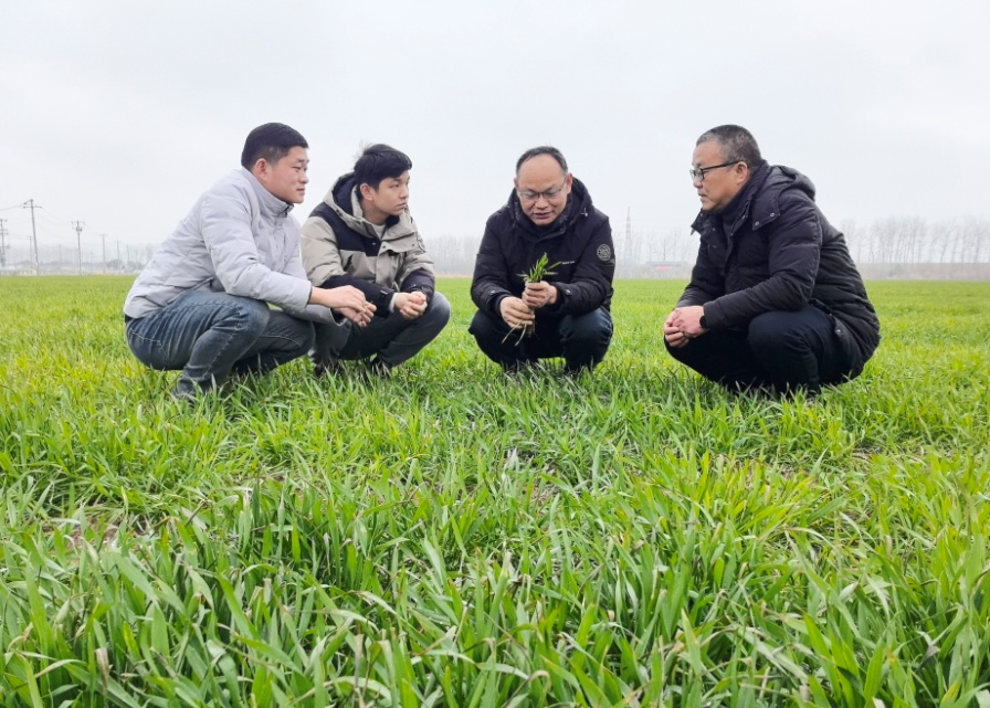 图为:皖河农场农业技术人员在调研小麦苗情。(徐丽燕 摄)
