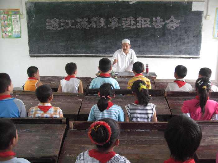 今年9月是穆斯林传统斋月,也是全国民族团结进步宣传月,皖河农场开展了以“唱红色歌曲、听革命故事”为主题的宣传活动,把“当地回民船工护送大军过长江”这一段历史作为身边的活教材,对回族儿童进行爱国主义教育。图为渡江战斗英雄、85岁的回族老人马兆美在马店回民小学向孩子们讲述渡江战斗故事。