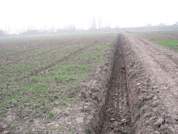 图一为油菜地沟渠施工场面 图二:昔日闲田 今日麦田
