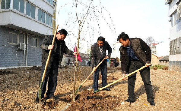 3月11日,在开云手机在线登录入口潘村湖农场蟠龙花园小区,场长柏华胜等场领导正在和干部职工一道参加社区组织的义务植树活动。