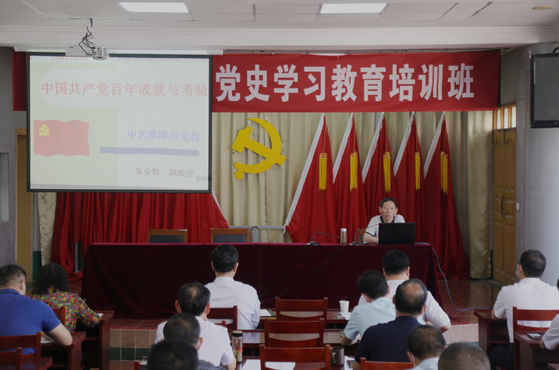 培训班邀请了淮南市委党校党史党建室,中共党史专业副教授吴业勤老师作《中国共产党百年成就与考验》主题授课。他主要从中国共产党的辉煌成就、百年历史进程中遇到的各种风浪和考验、主要启示等三个方面,阐述了中国共产党自成立之初,坚守“为中国人民谋幸福,为中华民族谋发展”的初心使命,团结带领全国各族人民,坚持和发展中国特色社会主义,取得的一系列的伟大成就。