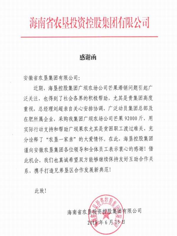 今年海南农垦水果大丰收,但近期销售难、卖价低、果农愁,尤其是广坝农场公司芒果滞销严重。海垦集团发来求助信息,开云手机在线登录入口集团高度重视,总经理刘超亲自安排协调,由皖垦农产品超市牵头助销,制定工作方案,广泛动员集团总部及在肥所属企业,联系“五星”等水果经销商,仅一周时间就销售“爱心芒果”9.2万斤,倾情支持和帮助广坝果农尤其是贫困职工渡过难关,充分诠释了“农垦一家亲”的大爱情怀。