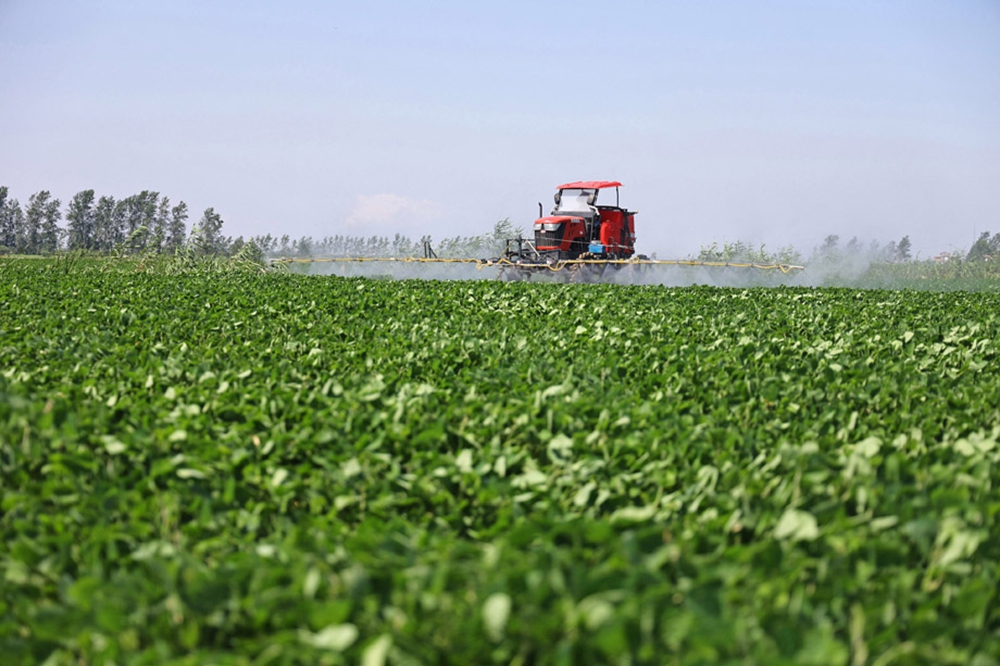 7月7日,华阳河农场公司第二农业分场的统一经营田里,农机手驾驶高架宽幅喷杆打药机进行大豆喷肥施药作业。李龙 摄