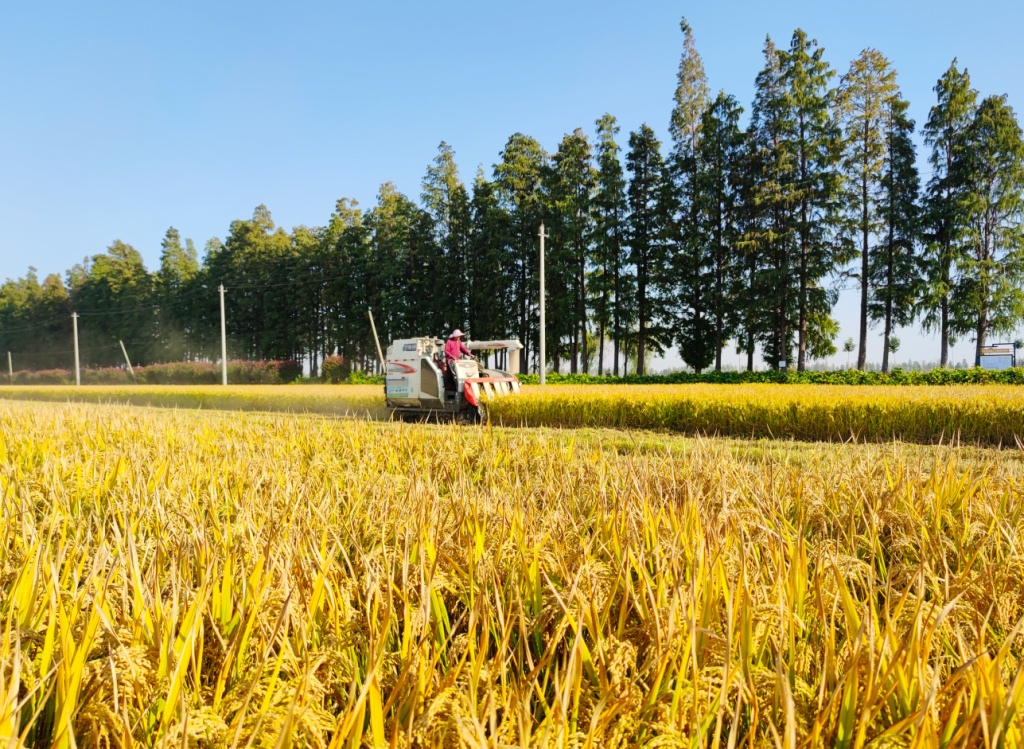 大圹圩农场“皖垦糯1116”品种水稻收获场景。