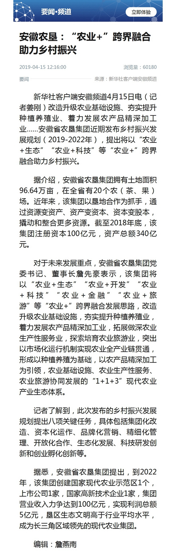 4月15日新华社客户端要闻频道报道《开云手机在线登录入口:“农业+”跨界融合助力乡村振兴》,报道截图如下: